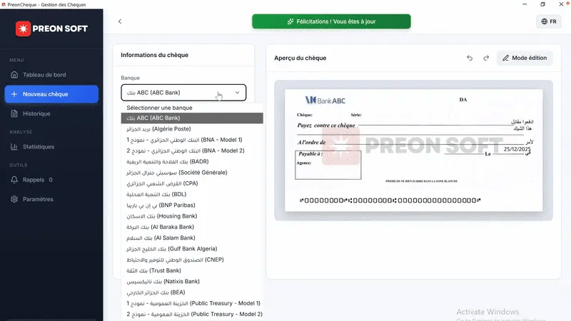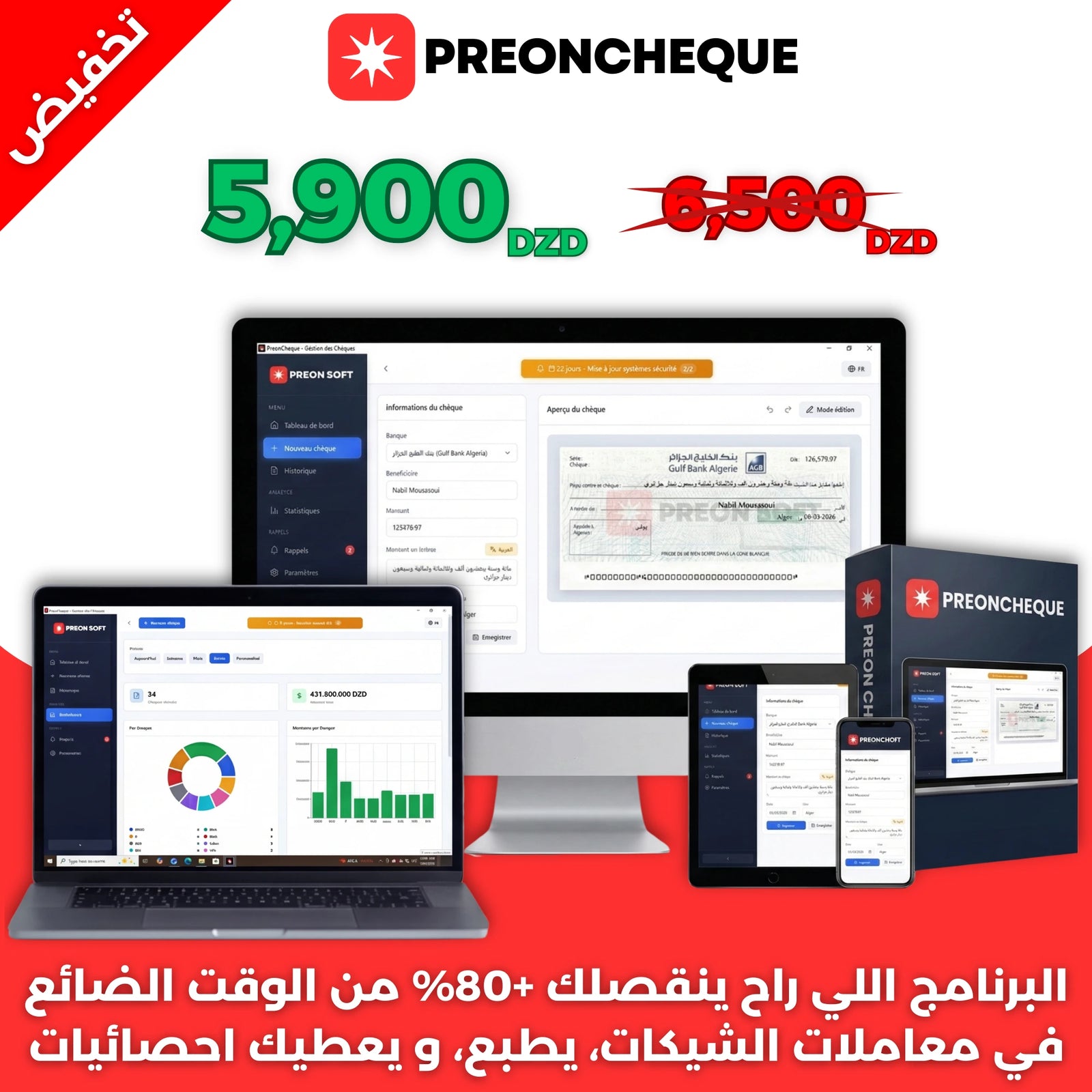 يعمل ببرنامج طباعة الشيكات، الشي لي يخليه يقتصد 80%+ من الوقت لي كان يضيعو معاهم. زيد عندو أشيف رقمي فيه كامل معاملاتو بدون انترنت، و عندو احصائيات دقيقة يرجعلها في اي وقت تخليه يعرف شحال من شيك خرج في مدة محددة، لشكون؟ و واش من بنك